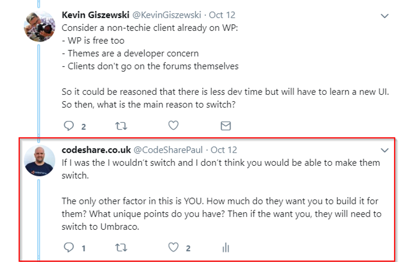 Then it dawned on me. He needed to work out what his unique selling points were, what was his personal brand? If he could do a good job of getting that across to the client then if they wanted him, they would have to switch to Umbraco.